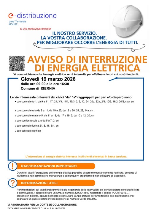 Enel avvisa gli utenti delle borgate di Isernia che per consentire dei lavori sugli impianti l’energia elettrica verrà interrotta nella…